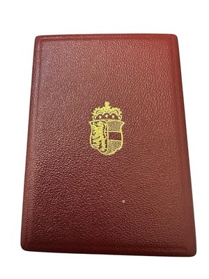 Im originalen weinroten Etui mit Goldprägung, inklusive passender Knopflochrosetten.