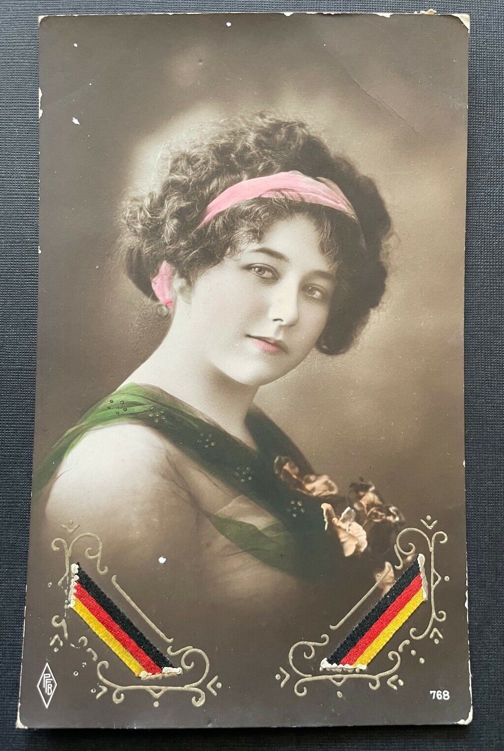 Porträt Frau Stirnband Kleid Tracht Locken Flagge Deutschland Präge 400375 TH F
