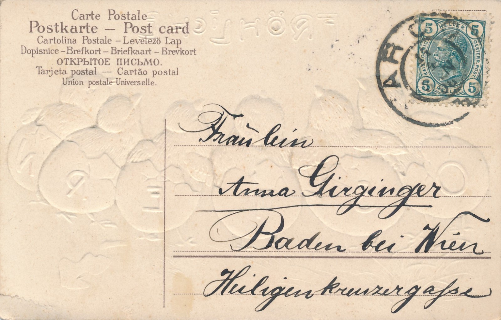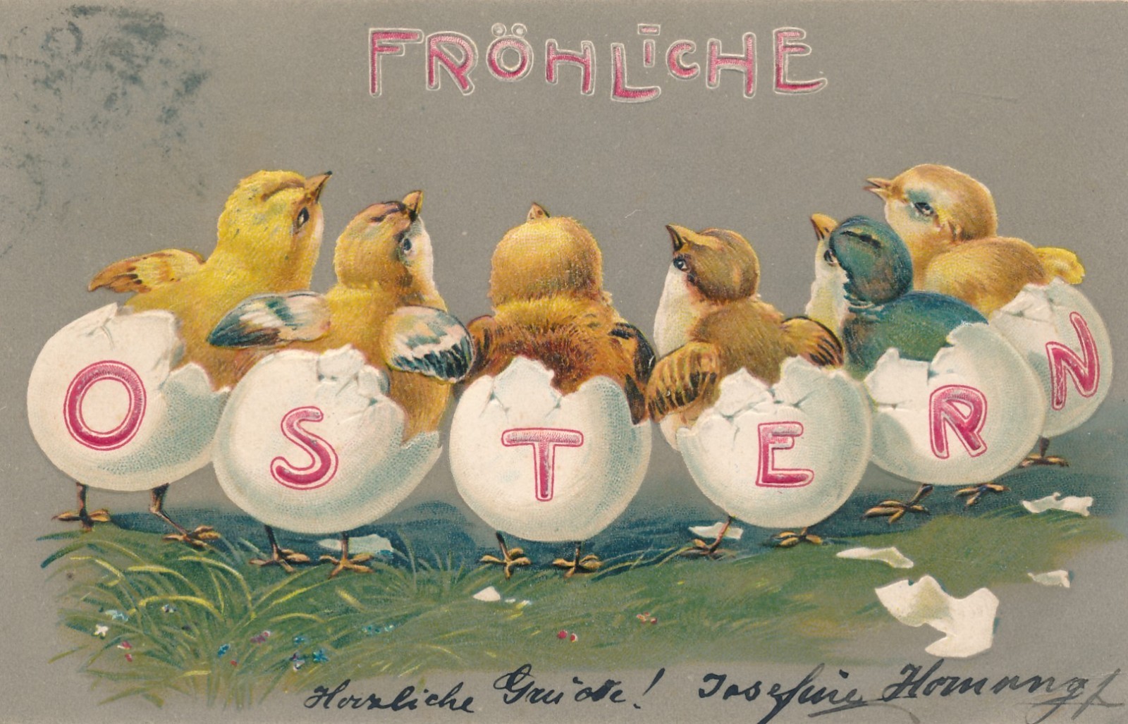 Präge - Glückwunschkarte Fröhliche Ostern Kücken mit Eierschalen (15981)
