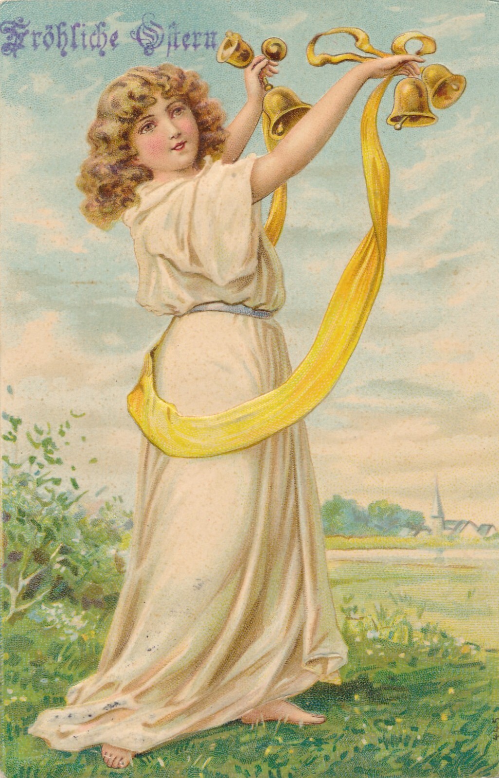 Präge-Karte, fröhliche Ostern, Kind mit Glocken, Ansichtskarte (S3683)