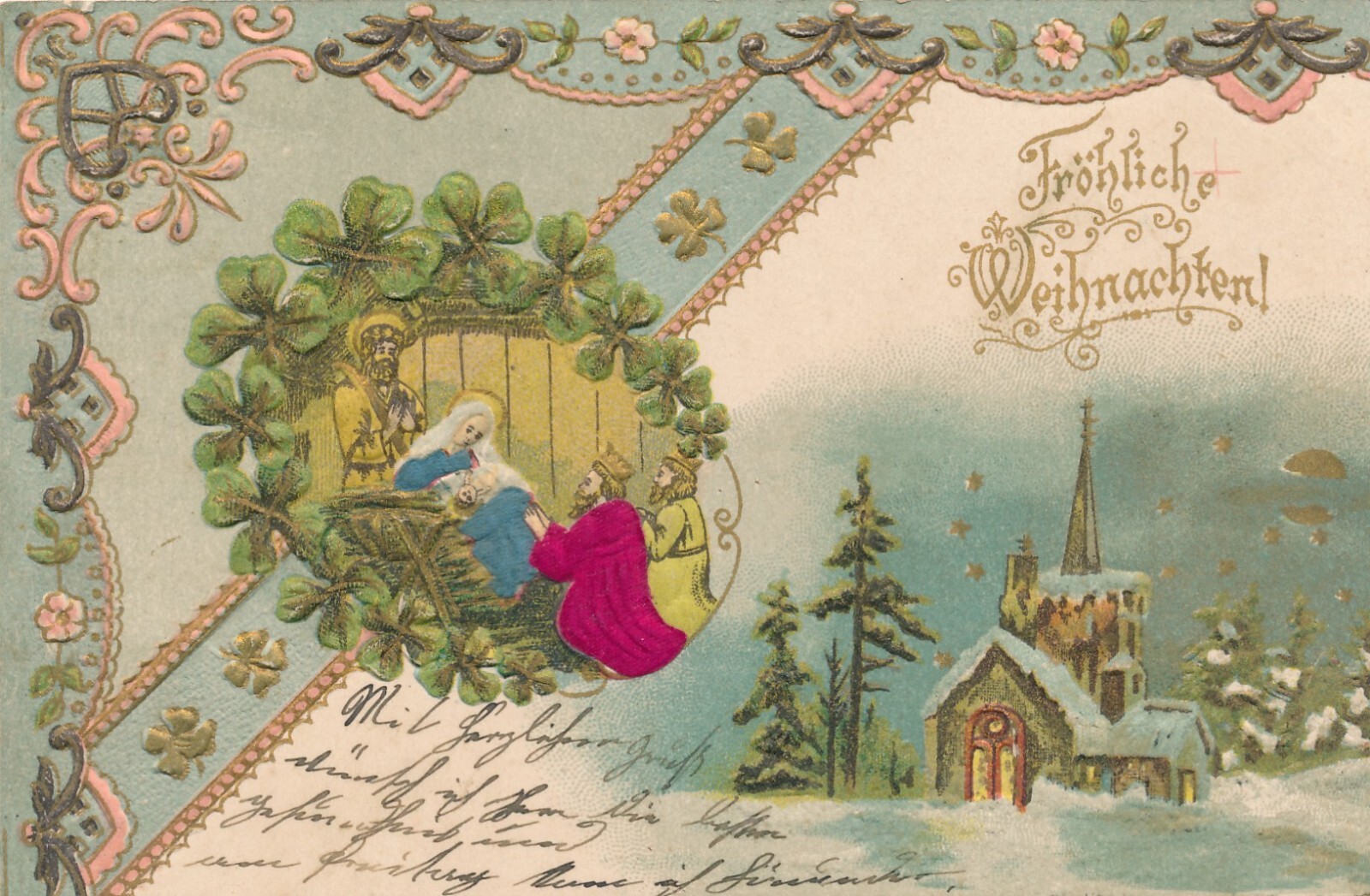 Präge Karte mit Stoff Fröhliche Weihnachten in der Grippe Ansichtskarte (12280)