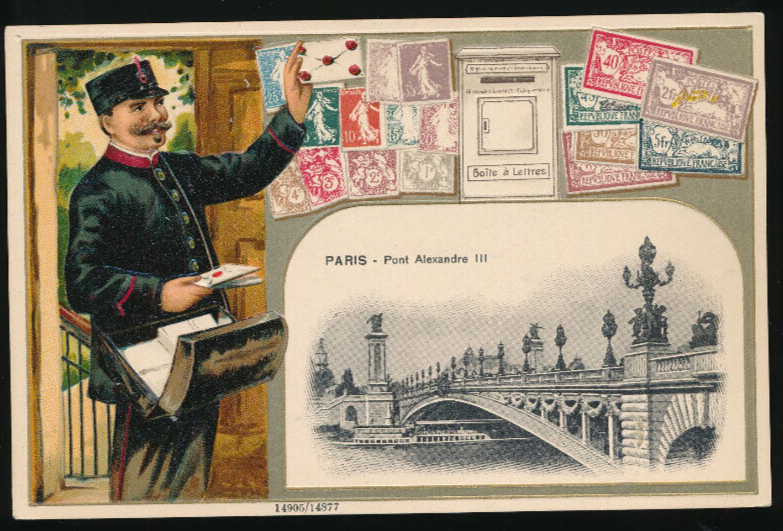 Präge-Litho-Karte Frankreich mit Wappen, Marken und Postboten (2752)