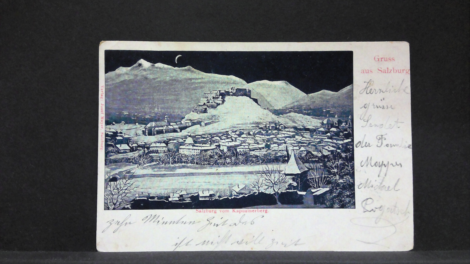 Salzburg vom Kapuzinerberg Winter Mond Schnee Zeichnung JW 6351