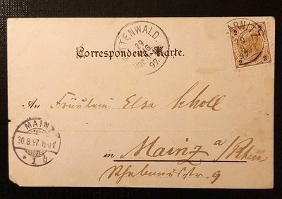 Die Karte wurde am 28. August 1897 in Mittenwald abgestempelt und an Fräulein Elsa Scholl nach Mainz am Rhein gesandt. Die 2-Kreuzer-Frankatur ist sauber gestempelt; auf der Vorderseite findet sich eine elegante, ausführliche Handschrift des Absenders.