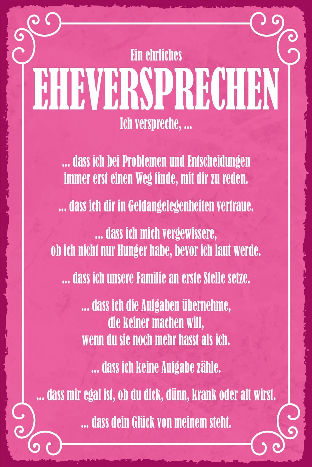 Schild Ehe Versprechen Heirat Aufgaben 12x18 / 20x30 / 30x40 Blech od. Holz