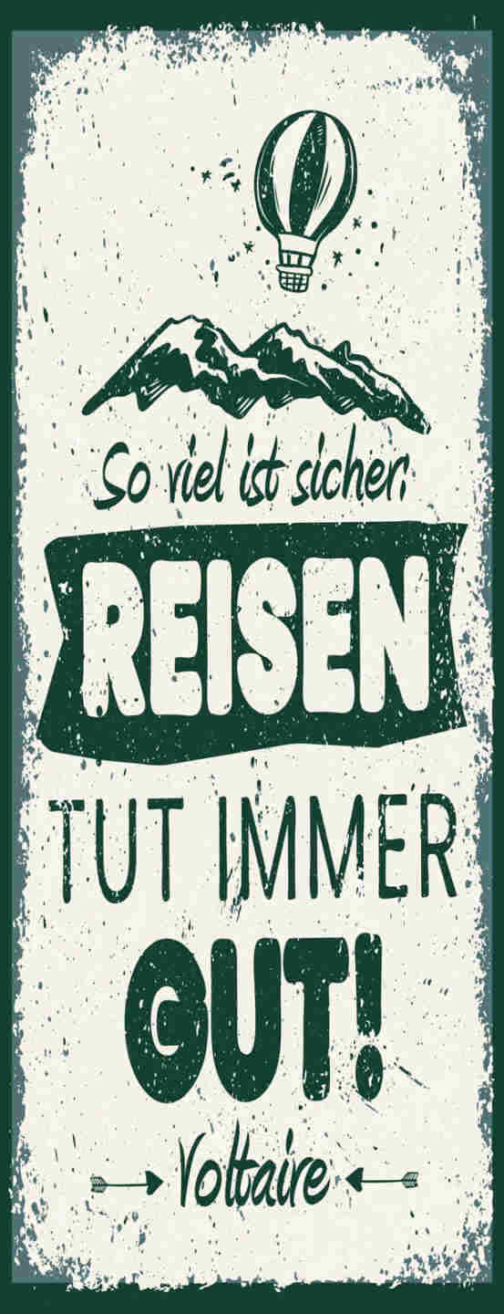 Schild So Viel Ist Sicher Reisen Tut Immer Gut Voltaire 27x10 Blech od.Holz