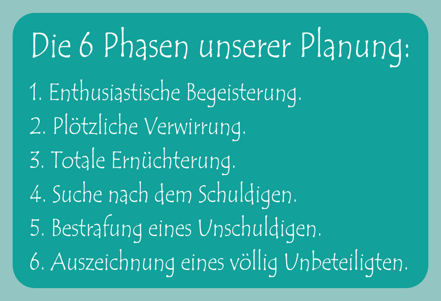 Schild Spruch Die 6 Phasen unserer Planung Begeisterung Verwirrung JW