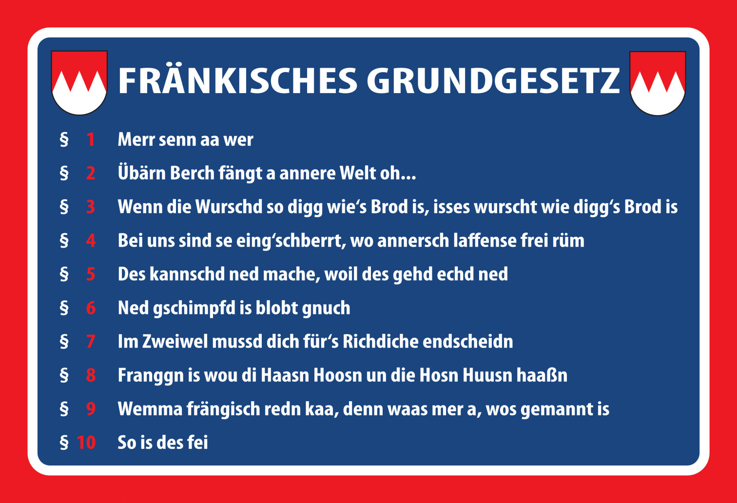 Schild Spruch Fränkisches Grundgesetz Dialekt §1 Merr senn aa wer JW