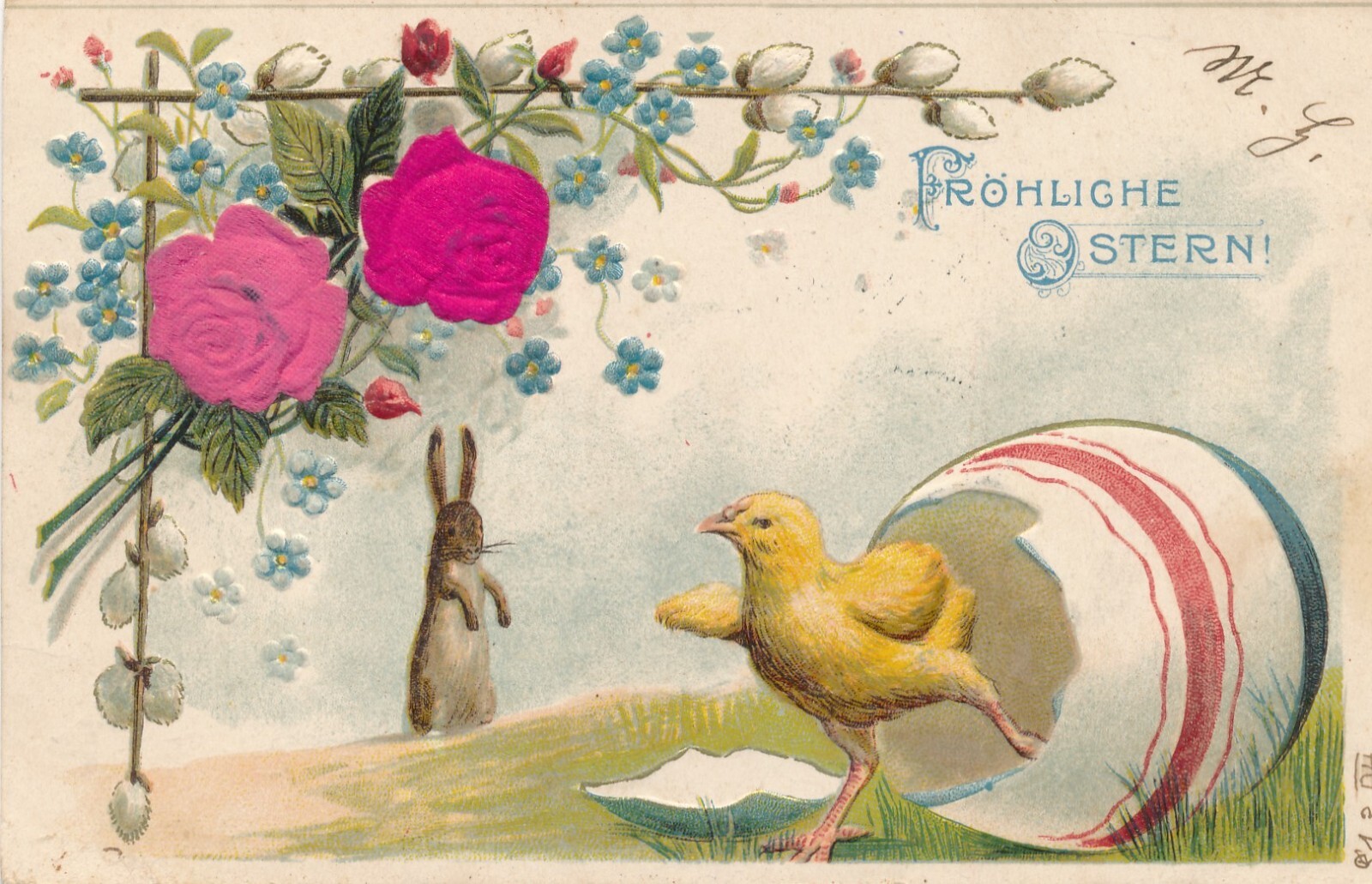 Stoff Präge Motiv - Karte Fröhliche Ostern Kücken aus Ei Ansichtskarte (13695)