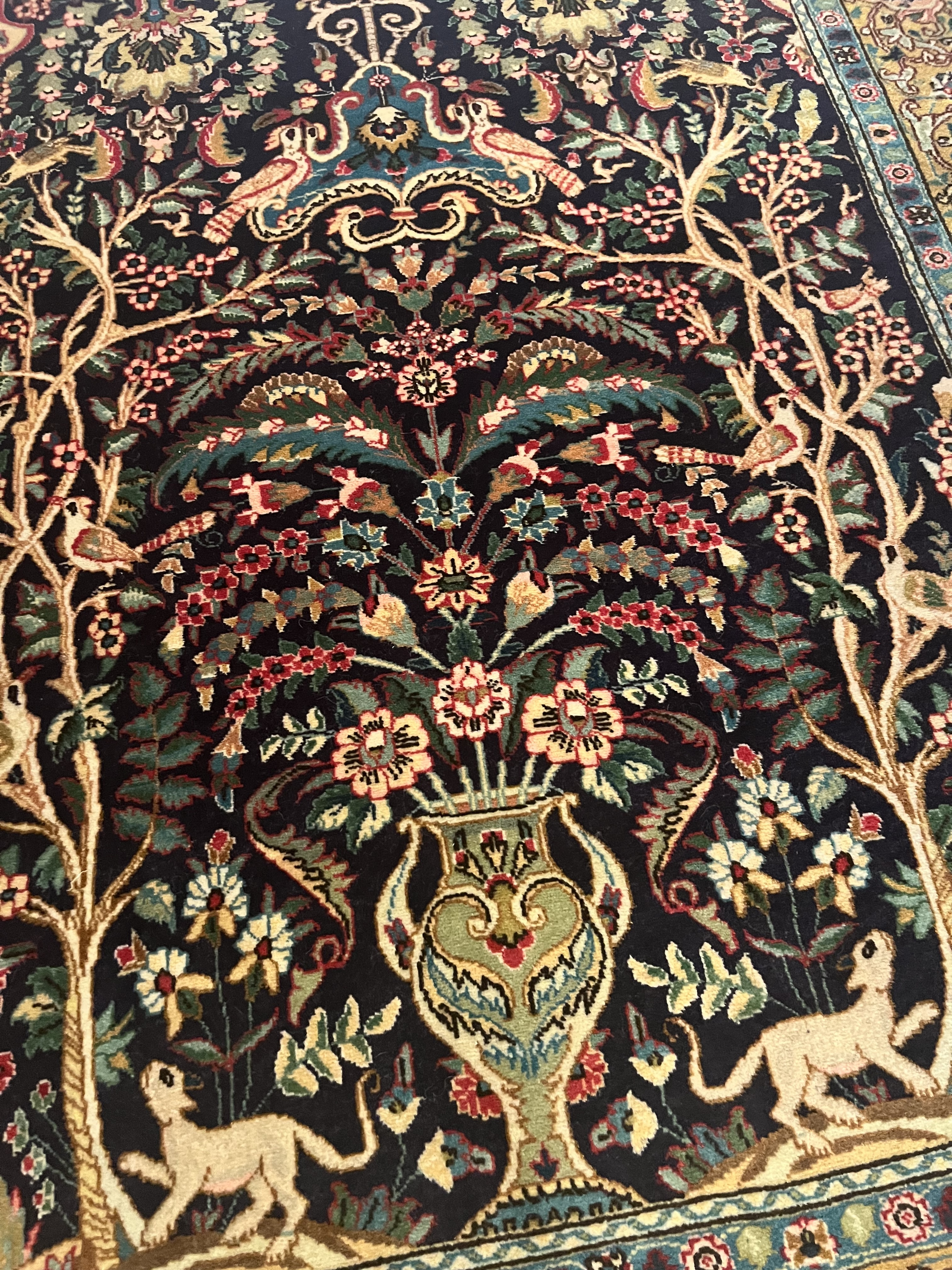 Gegenstand: Handgeknüpfter Teppich Bezeichnung: Ghom Provenienz: Iran Flor: Schafwolle Kette: Baumwolle Länge x Breite: ca. 140 x 100 cm = 1,4 qm Alter: ca. 1970 Zustand: dem Alter entsprechend sehr gut Handelsstufe: Zeitwert Wert (ca.): 700 € Datum: 2025-04-12