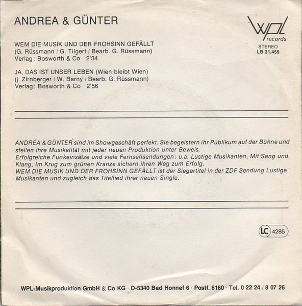Vinyl / Andrea Und Günter - Wem Die Musik Und Der Frohsinn Gefällt