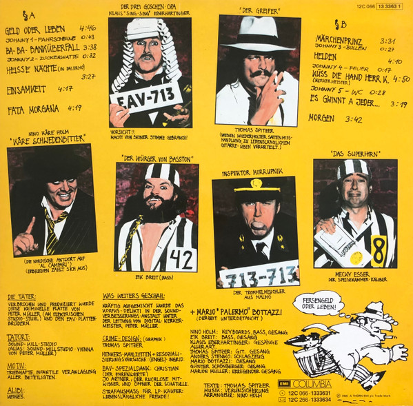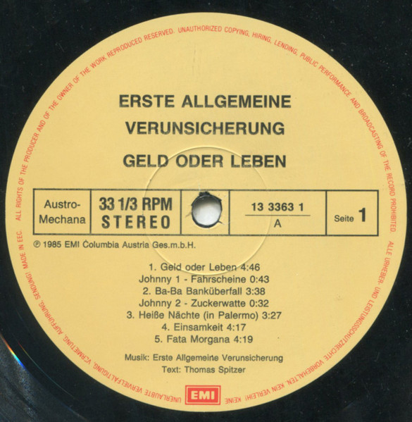 EAV (Erste Allgemeine Verunsicherung) - Geld Oder Leben!Format: Vinyl, LP, Album, StereoLabel: EMI - Cat#: 13 33631Released: Austria, 1985Genre/Style: Electronic, Rock, Pop, Pop Rock, Novelty, Synth-popMedia Condition: Near Mint (NM or M-)Sleeve Condition: Near Mint (NM or M-)Tracklist:A1. Geld Oder Leben (4:46)A2. Johnny 1 - Fahrscheine (0:43)A3. Ba-Ba-Banküberfall (3:38)A4. Johnny 2 - Zuckerwatte (0:32)A5. Heisse Nächte (In Palermo) (3:27)A6. Einsamkeit (4:17)A7. Fata Morgana (4:19)B1. Märc...
