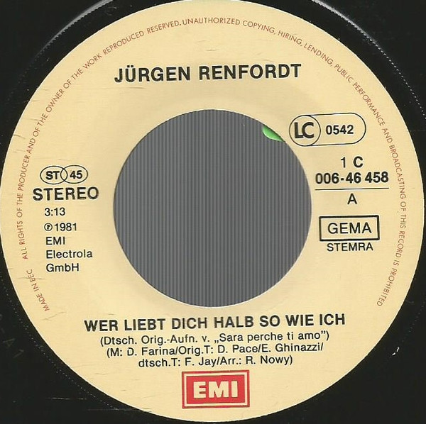 Vinyl / Jürgen Renfordt - Wer Liebt Dich Halb So Wie Ich
