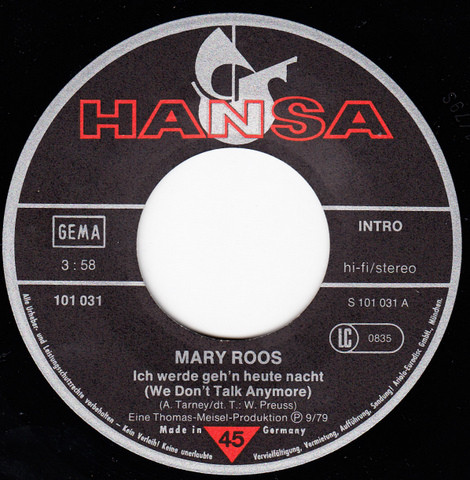Vinyl / Mary Roos - Ich Werde Geh'n Heute Nacht (We Don't Talk Anymore)