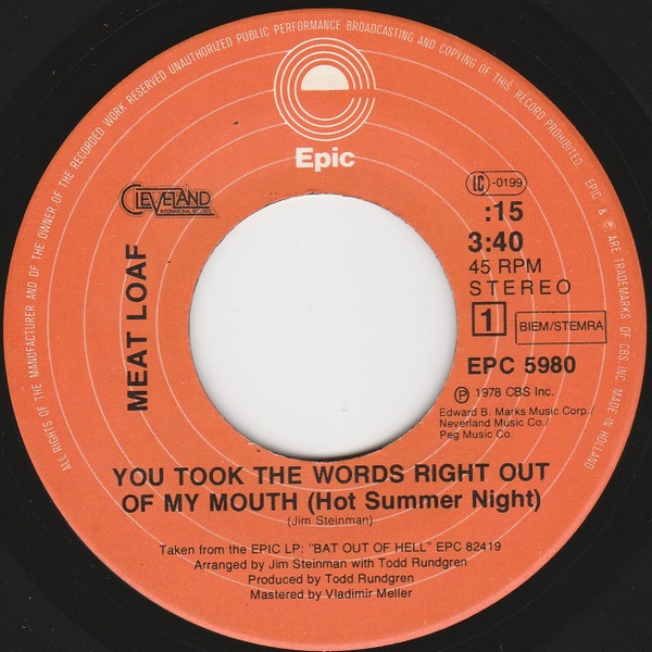 Vinyl / Meat Loaf - You Took The Words Right Out Of My Mouth (Hot Summer Night)