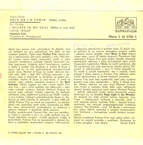 Vinyl / Michal Prokop, Framus Five - Hold On I'm Comin' / I Believe To My Soul