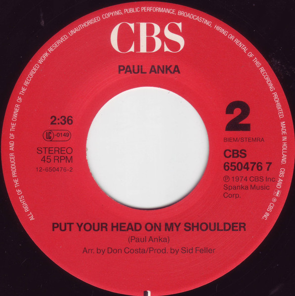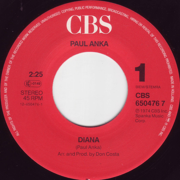 Vinyl / Paul Anka - Diana / Put Your Head On My Shoulder