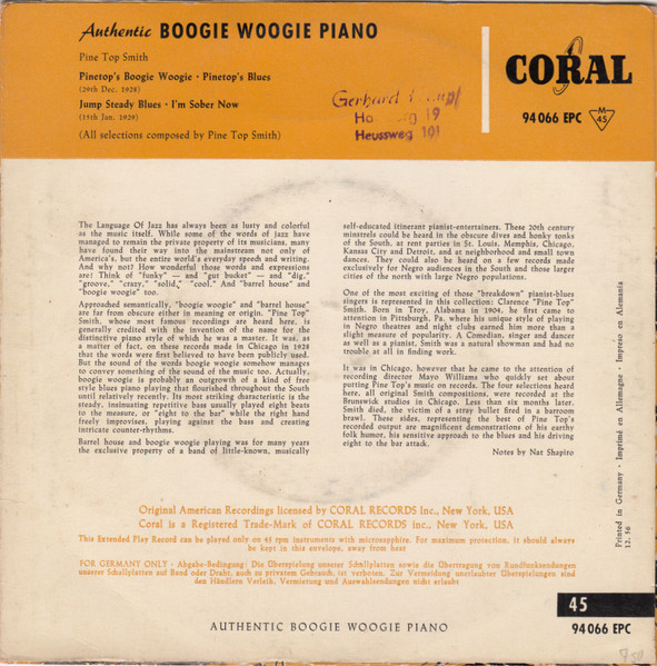 Vinyl / Pine Top Smith* - Authentic Boogie Woogie Piano