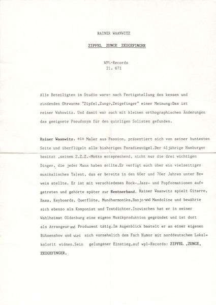 Vinyl / Rainer Waanwitz - Zipfel, Zunge, Zeigefinger