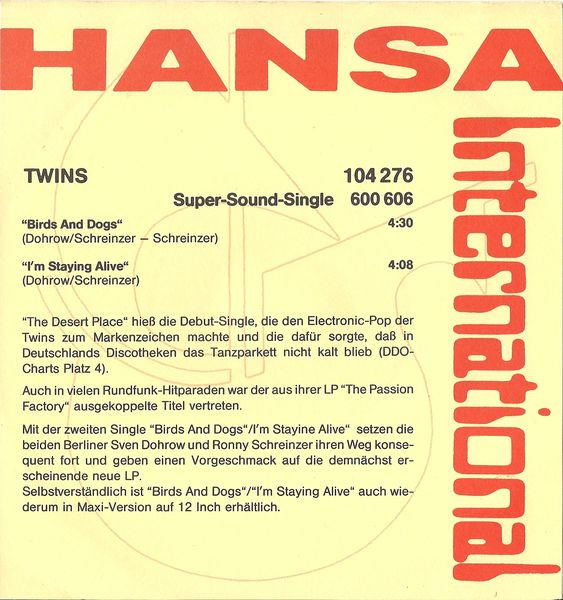 Vinyl / Twins* - Birds And Dogs / I'm Staying Alive