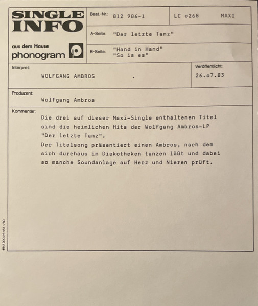 Vinyl / W. Ambros*, № 1* - Der Letzte Tanz